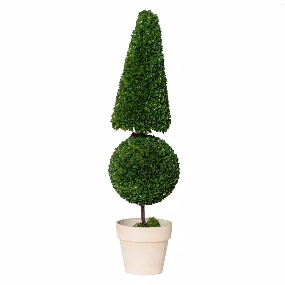 - Topiary is shaped with ball and cone design in cream terra cotta pot