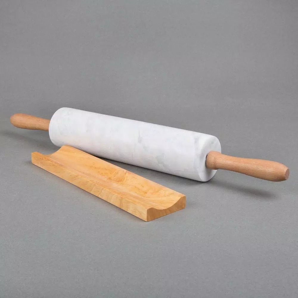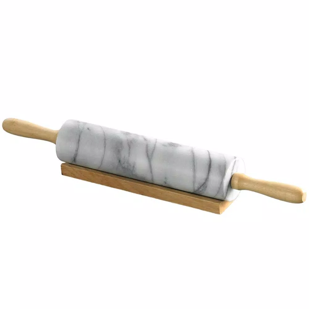 This 18 in. L marble rolling pin has a large comfort grip (4 in. L each side), Wooden handles and a wooden cradle to hold the rolling pin when not in use. Marble keeps moisture, grease and odors from penetrating. It’s easy to clean and is non porous. Hand crafted and carved from whole piece genuine natural marble stone, any Color variation is its own uniqueness. Dimensions: Overall 2-1/4 in. Dia. x 18 in. L; marble: 10 in. L, handle: 4 in. L each side. The smoothness and heft of the marble make it ideal for a rolling pin. Comes with a wood cradle for your rolling pin when not in use. Easy to clean, hand washing recommend.
