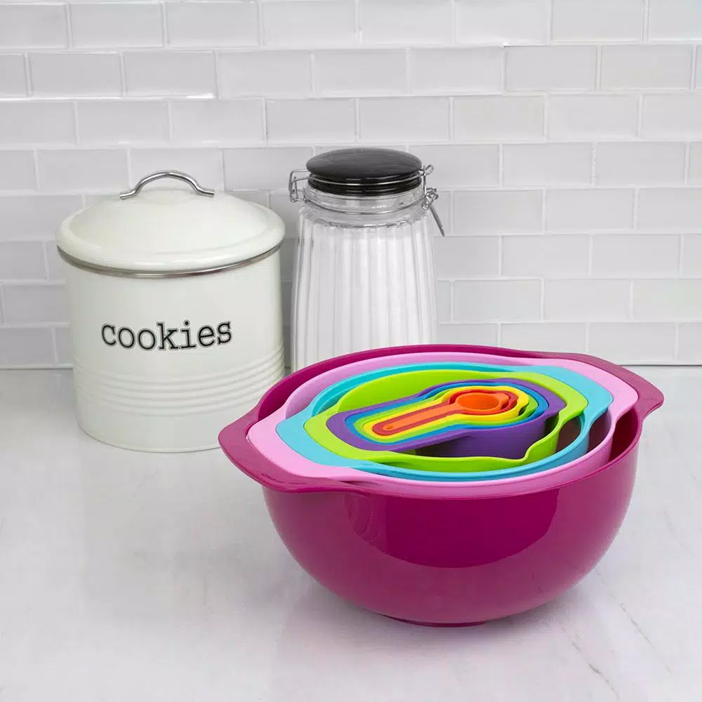 - Set includes a large mixing bowl, colander, sieve strainer, small mixing bowl, set of six measuring spoons, 1 cup, 1/2 cup, 1/3 cup, 1/4 cup, 1 tsp, tbsp.
