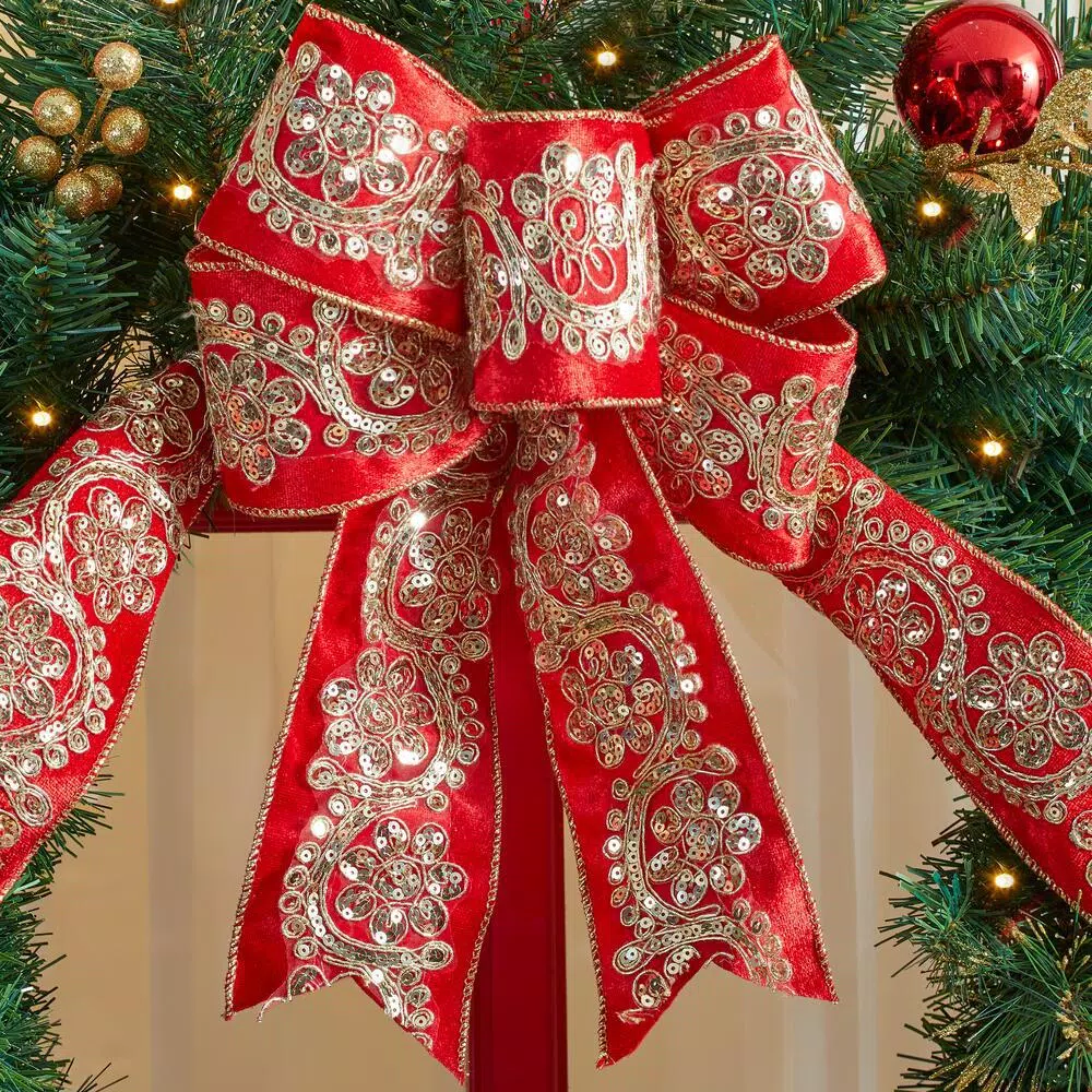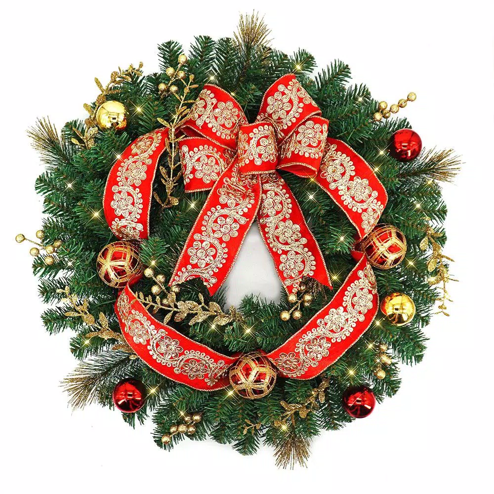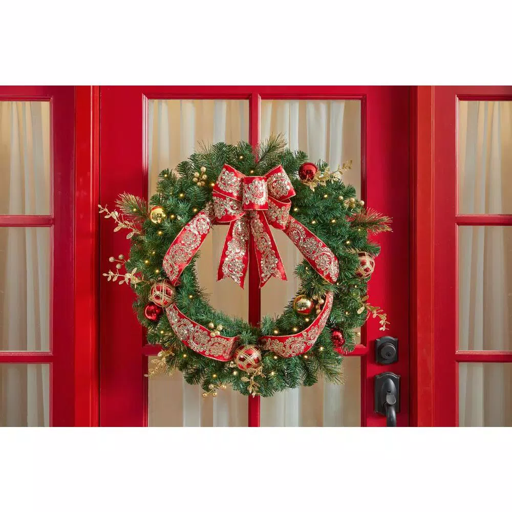 Light up the holidays with this 30 in. Royal Easton artificial wreath by Home Holiday Accents. Illuminated with 35 warm white lights, the natural-looking wreath is perfect for above your fireplace or a stairway rail. It has red and gold ornaments, gold sprigs and a lacy ribbon. Its long-lasting LED bulbs use up to 80% less energy than incandescent lighting. This pre-lit garland is rated for indoor and outdoor covered use and uses 3 AA batteries (not included).