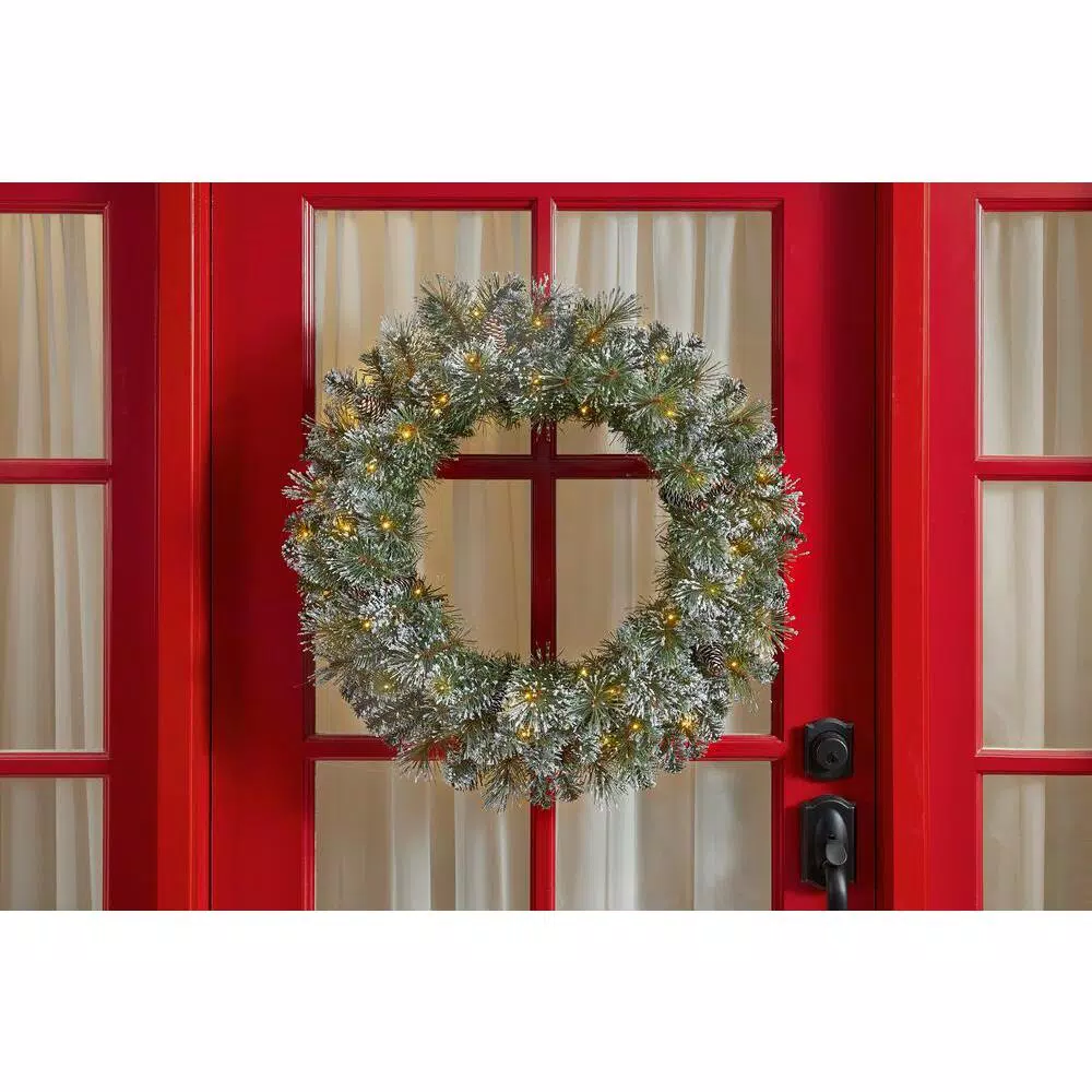 Add a beautiful touch of holiday cheer to your home with this 30 in. Battery Operated Pre-lit LED Artificial Sparkling Amelia Pine Christmas Wreath with 50 Warm White Micro-Dot Lights. Each wreath features pine cones and snowy tips to add a unique appearance to your holiday decor. Easily illuminate your entire 50 light wreath with 2 D batteries. Features a timer for an easy on/off function.