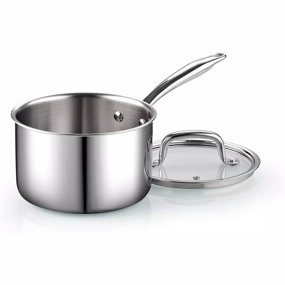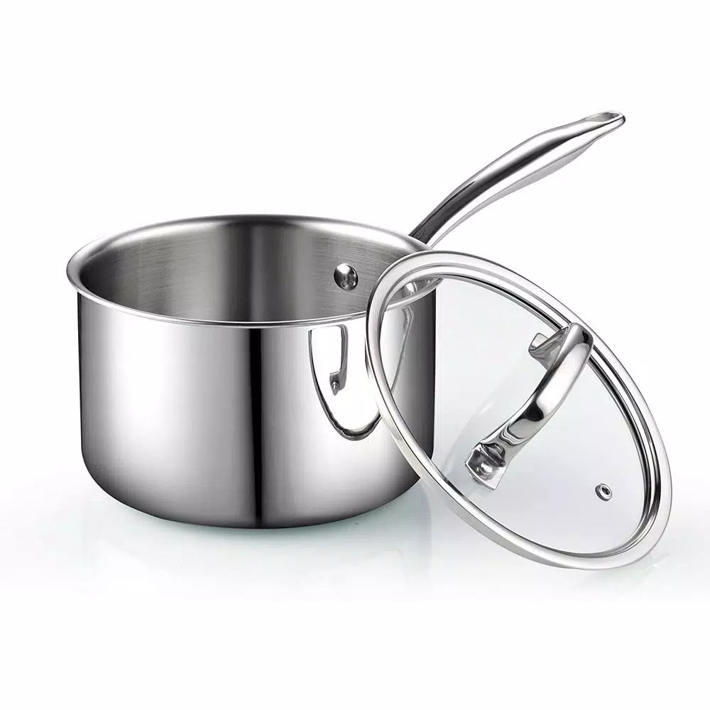 The Cook N Home 02680 Tri-Ply Clad Stainless Steel Sauce Pan with Lid 3 qt. sauce pan comes with a tempered glass lid with steam vent to view food and keep heat/moisture in and a riveted handle for strength. The Tri-ply Clad metal construction is made of 18/10 stainless steel with an aluminum core creating a permanent bond of metal allowing heat to pass through the whole pan-along the bottom and up. This pan works on all stove tops.