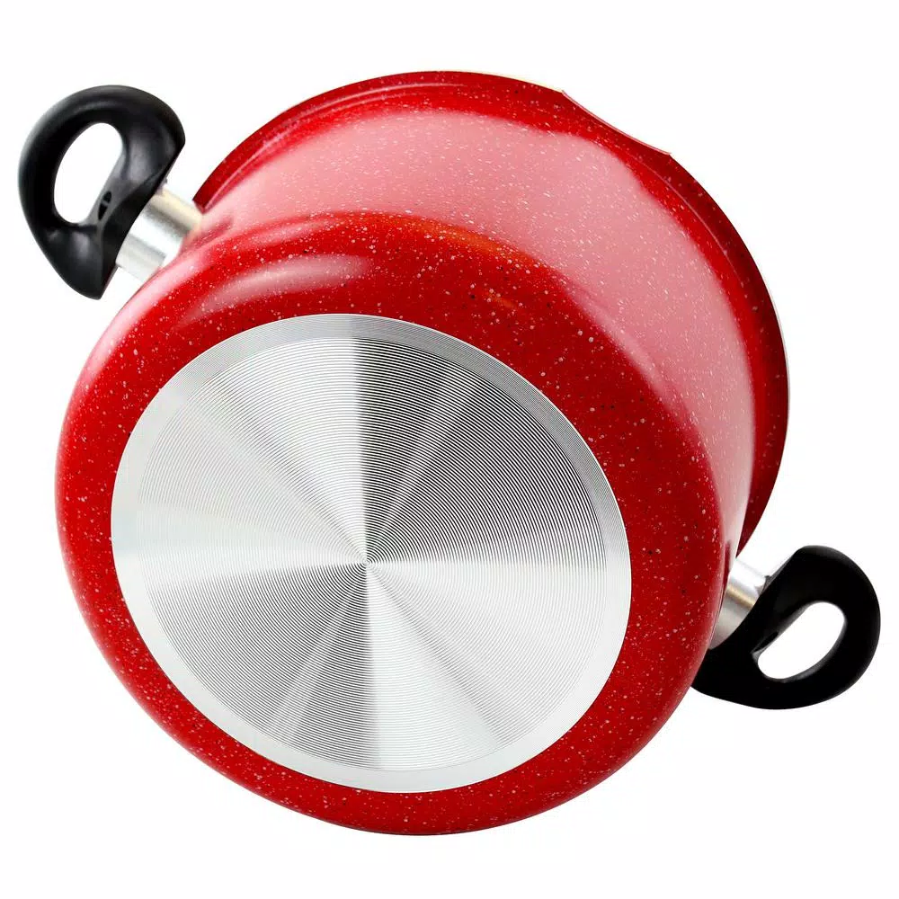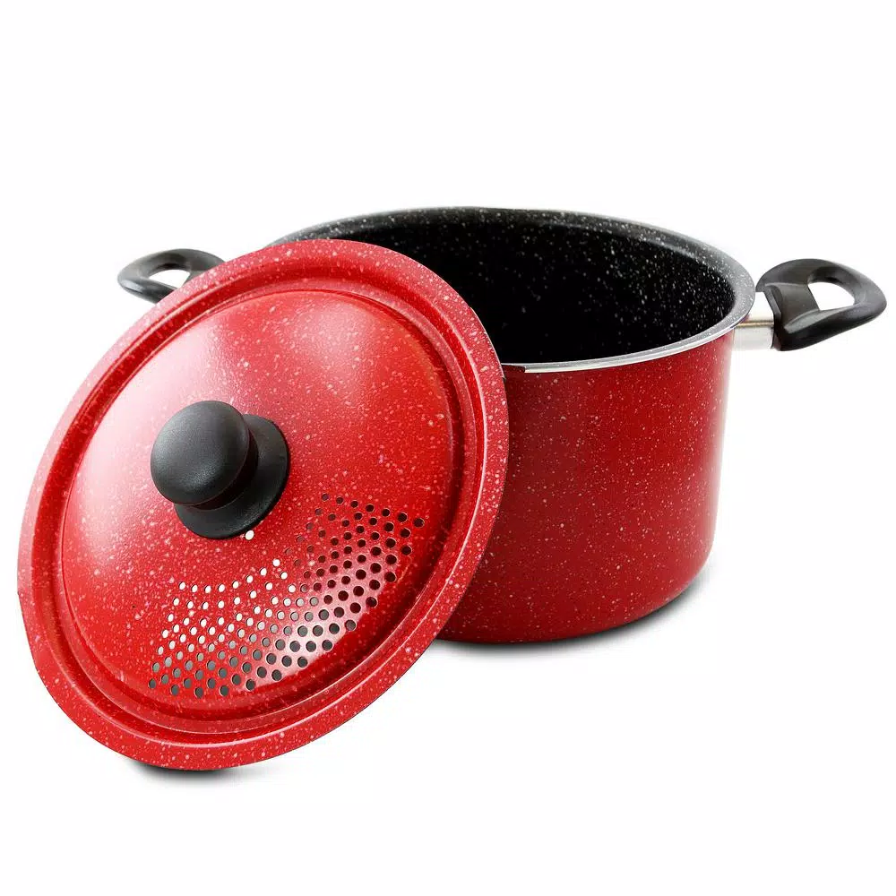 The Gibson Granita 6 Qt. Aluminum Pasta Pot with Carbon Steel Lid in Red Speckle is ideal for making pasta, but can also be used for hearty soups, stews, vegetables and so much more, This vibrantly colored pot is not only stylish, but it’s aluminum constructed nonstick interior and easy-clean exterior makes it durable and efficient enough for everyday use. The pasta pot is built with two 2.5 in. riveted Bakelite handles to prevent against potential injury and to safely carry your culinary creations from one location to another. Make this beautifully decorated and functional pasta pot be the next addition to your at-home kitchen collection.