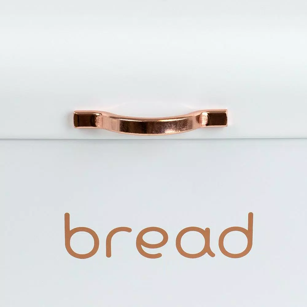 A contemporary take on the classic bread bin, this modern and elegant storage container features a crisp white finish with a gleaming rose gold metal handle. Stock it up with freshly made artisanal bread to store bought rolls this beautiful bread bin offers plenty of room to store it all. The lid closes firmly keeping your bread free from the elements. It is equipped with ventilation holes that allow air to flow through the lid to keep mold away, while gathering up enough moisture to keep bread fresh. To top it off, its cleared labeled with the words bread eliminating the guess work of what is inside the bin so when dinner time rolls youll know where the bread will be stashed.