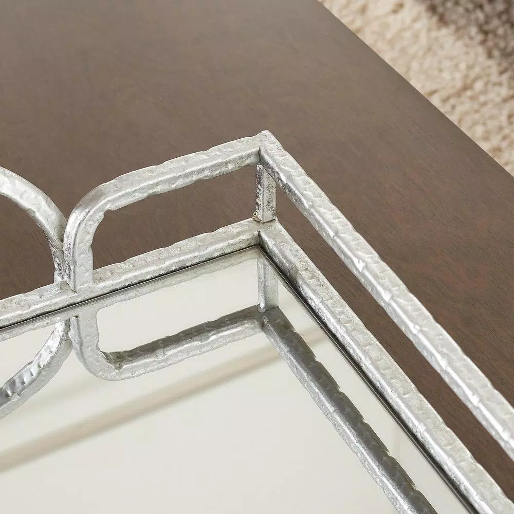 Add a touch of sparkling grace to your entryway table or showcase with the Silver Hammered Metal Decorative Rectangle Mirror Tray from Home Decorators Collection. It features a silver metal framework with a hammered finish that complements a classic-glam decor. The mirrored platter surface serves as an ideal platform for arranging showpieces and ornaments creatively. The tray has two handles that enable easy carrying. Use a soft, dry cloth to wipe this decorative tray for a clean and shiny look.