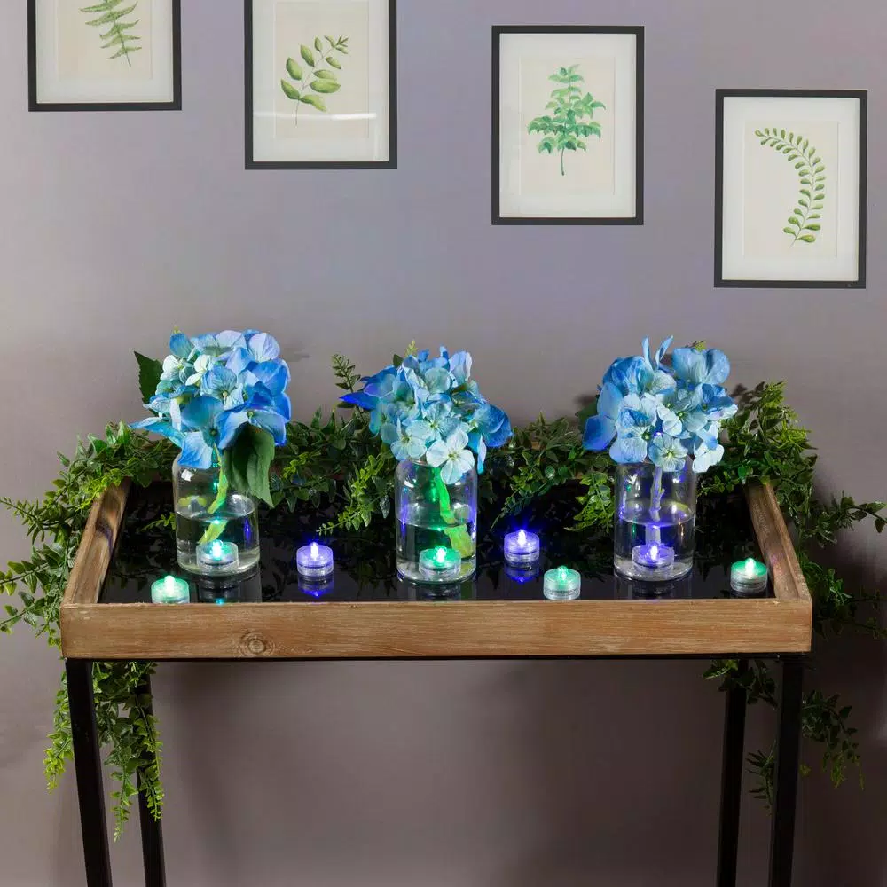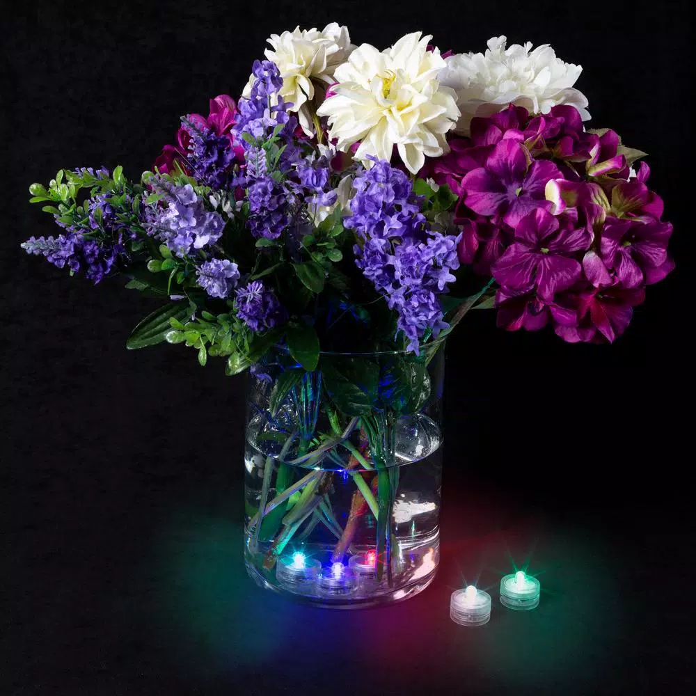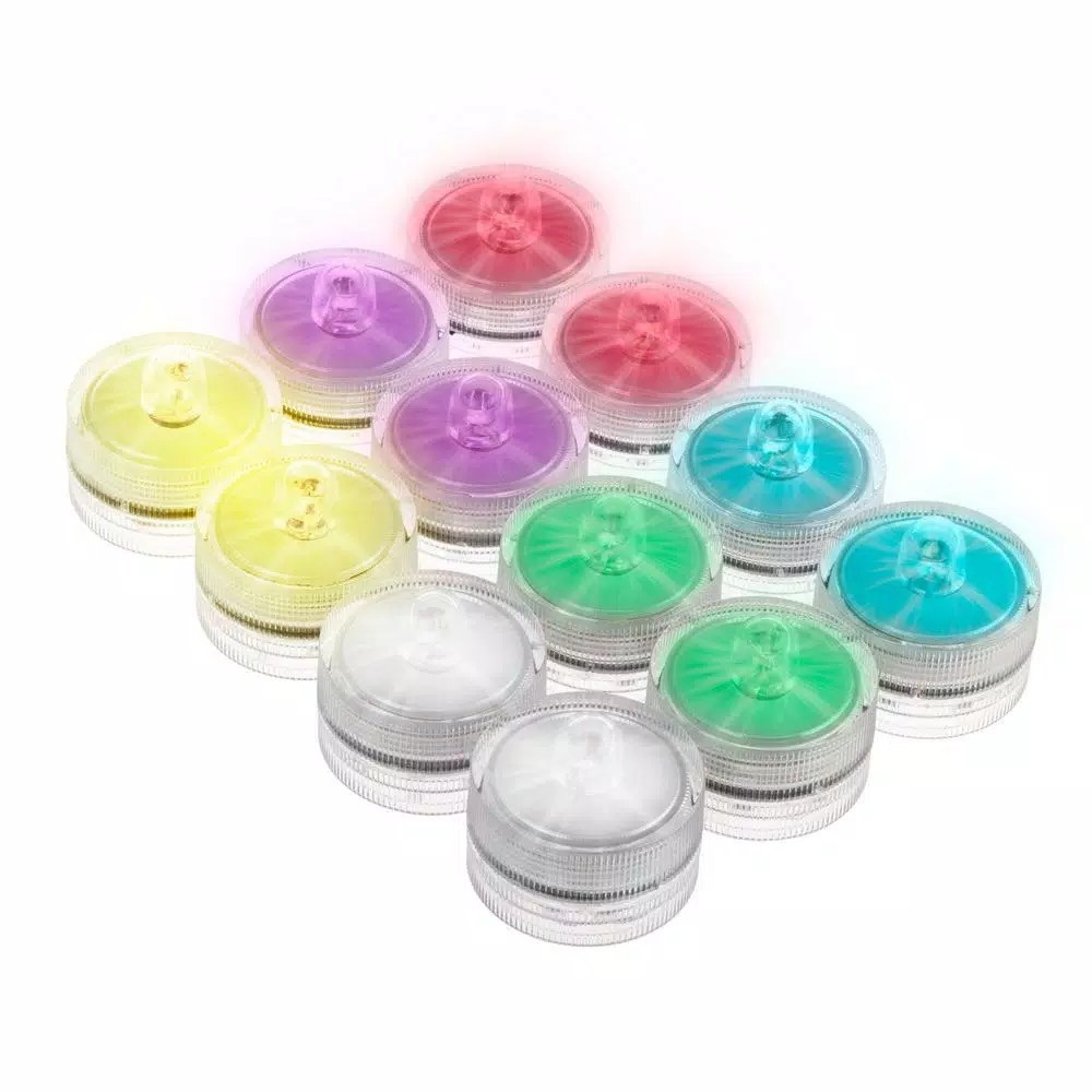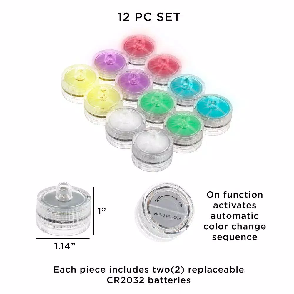 Create effortless ambiance at your next event with the Waterproof LED Color Changing Tealights (12-Pack). With an automatic color change sequence of purple, red, blue, green, yellow and white, these lights will add an enchanting touch of color to your tub, aquarium, fountain or centerpiece vases. These versatile waterproof tea lights are submersible in water and can be used out of water as well. These battery powered LED lights have an easy twist on/off switch and are energy efficient, providing up to 50,000-hours of illumination.