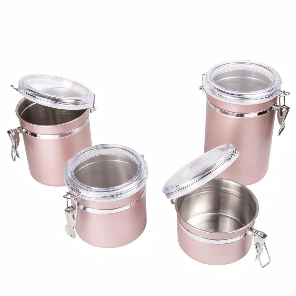 This 4-Piece stainless steel canister set, food storage container with air tight lid and locking clamp, Rose Gold color finish is made of rust-resistant stainless steel and beautiful “Rose Gold” finish, this canister set will decorate any kitchen perfectly and durably. See through acrylic lid with silicone gaskets and locking clamp to help preserve and stored food items. Great for storing coffee beans, tea, sugar, flour, cookies and milk powder. This canister set contains 4-different capacity size, include 1 each of 26 oz., 36 oz., 47 oz. and 62 oz. Wipe canister with a damp cloth, easy cleaning.
