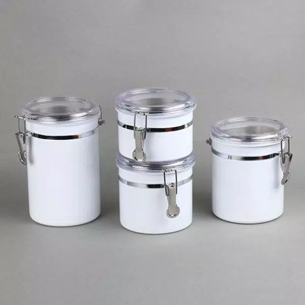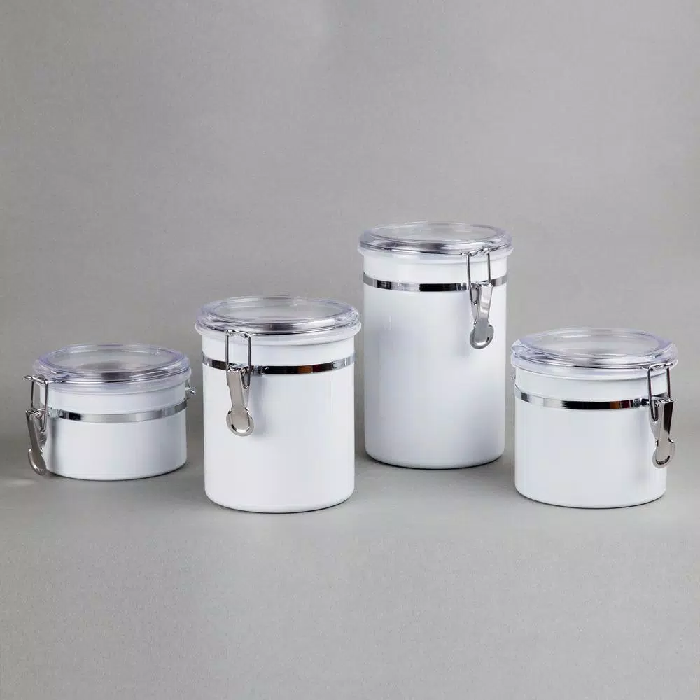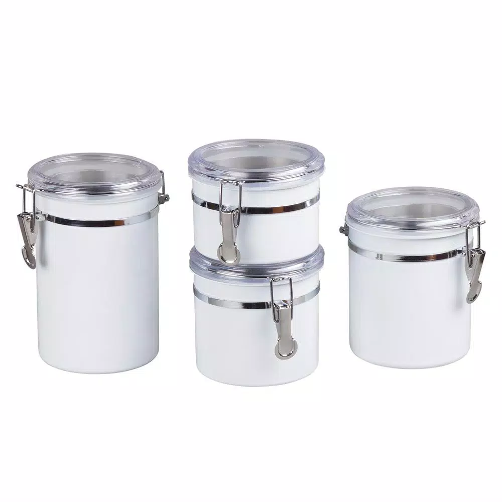 This 4-Piece stainless steel canister set, food storage container with air tight lid and locking clamp, White color finish is made of rust-resistant stainless steel and beautiful white powder coating, this canister set will decorate any kitchen perfectly and durably. See through acrylic lid with silicone gaskets and locking clamp to help preserve and stored food items. Great for storing coffee beans, tea, sugar, flour, cookies and milk powder. This canister set contains 4-different capacity size, include 1- each of 26 oz., 36 oz., 47 oz. and 62 oz. Wipe canister with a damp cloth, easy cleaning.