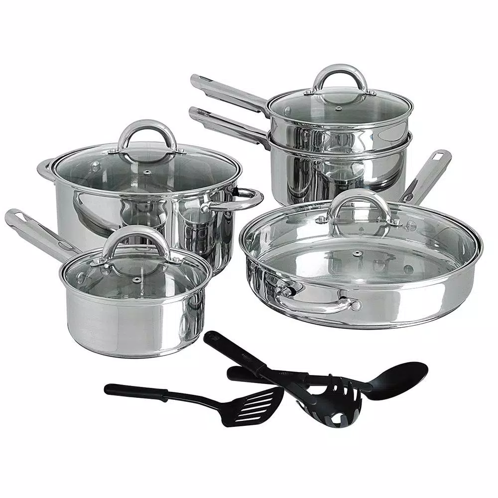Cusine Select Abruzzo Stainless Steel 12 Piece Cookware Set provides the kitchen essentials for everyday cooking. This stainless steel cookware set is stain and rust resistant and was crafted for long-lasting durability. It features an aluminum-encapsulated base for even cooking. The riveted hollow stainless steel handles remain cool to the touch for safe and comfortable gripping. The see-through tempered glass lids make monitoring your food easy without losing heat or moisture. For added convenience, three heat-resistant utensils are included to fit your everyday needs.