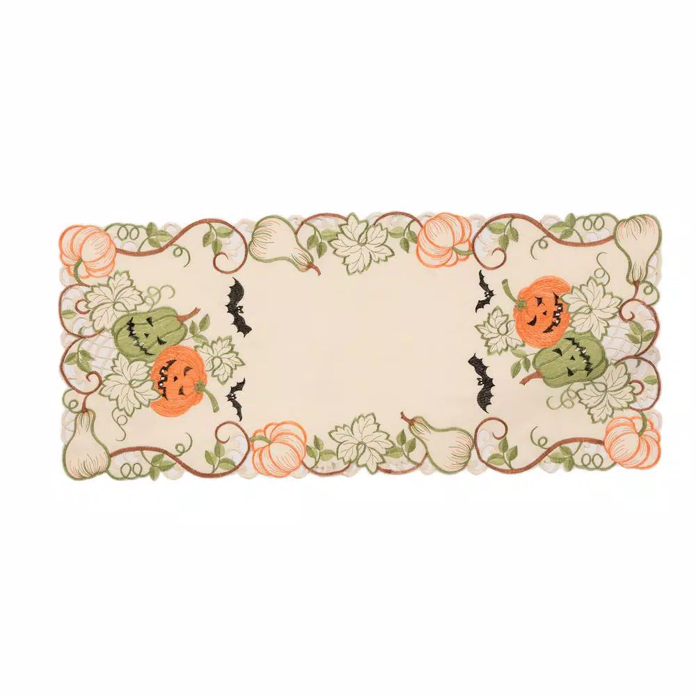 - Halloween happy jack-o-lanterns are hand rendered in embroidery and cutwork on ivory fabric