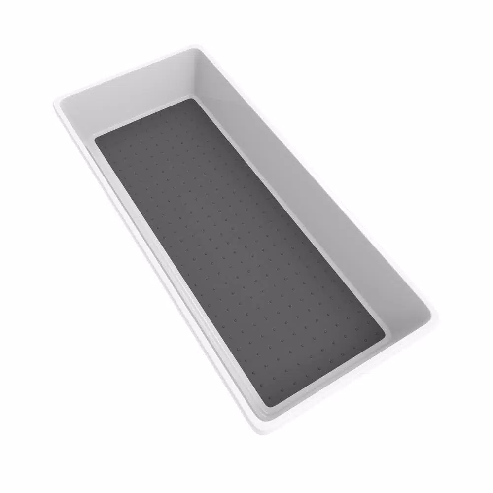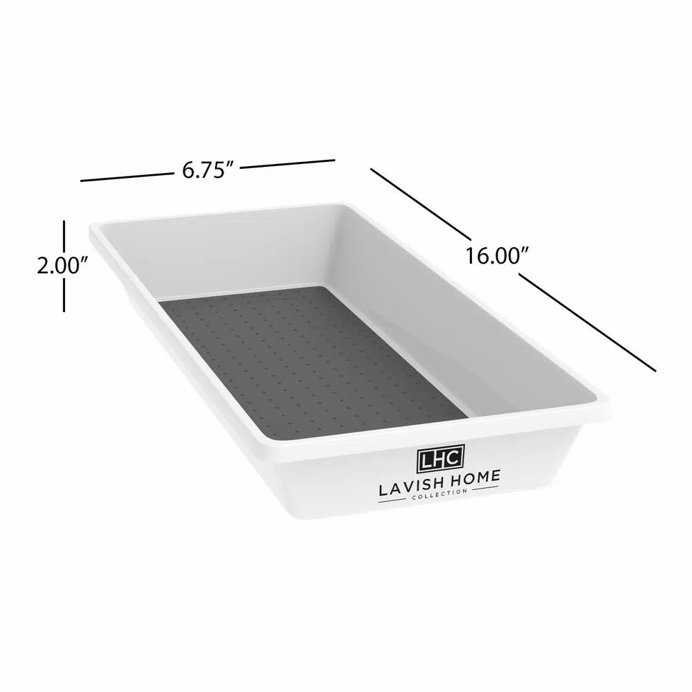 Keep your home neat and organized with the Plastic Drawer Organizer Tray by Lavish Home. This tray organizer is made of polypropylene plastic with a non-slip rubber liner to keep your cutlery, office supplies or makeup securely in place. It also features 4 nonslip rubber feet to keep the tray from sliding around in the drawer. This organizer is great to use in your office, bedroom or bathroom to keep office supplies, jewelry and make up organized and easy to access. The tray measures just 6.75 in. wide, meaning it wont take up the whole drawer so you can keep both large and small items organized.