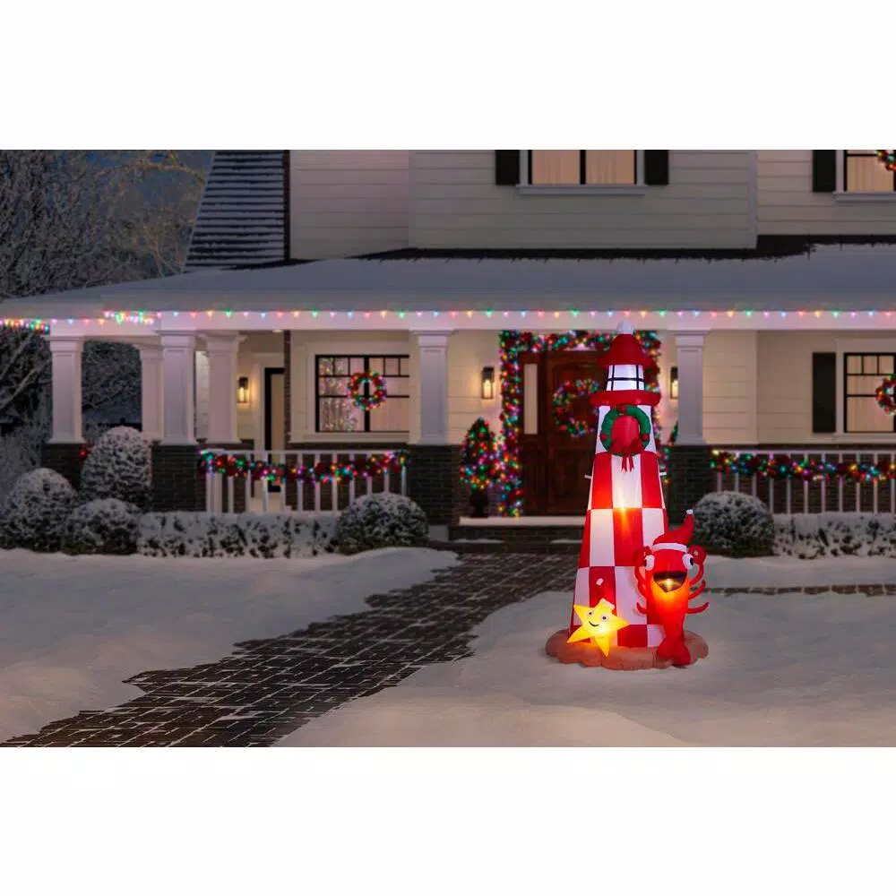 Deck the yard with an Airblown Inflatable lighthouse. Accented with a starfish and lobster in Santa hats. This charming Christmas inflatable makes an eye-catching addition to your outdoor Christmas decorations. Setup is super simple. Just plug it in, stake it down and watch the magic unfold. Includes everything needed for easy outdoor setup.