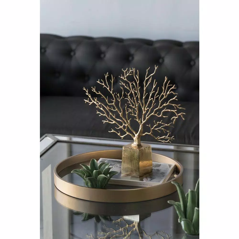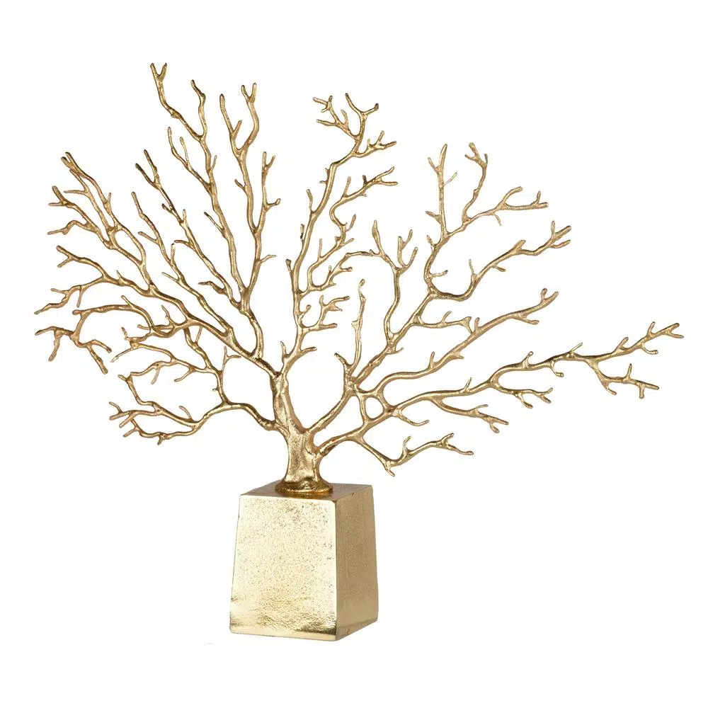 Artistic and abstract, this eye-catching sculpture mimics the shape of a stylized tree or coral. This sculpture is crafted from 50% and 50% aluminum, finished in radiant gold for glamorous appeal. This piece measures at 15 in height to make a dramatic impression on a desk, shelf, or mantle.