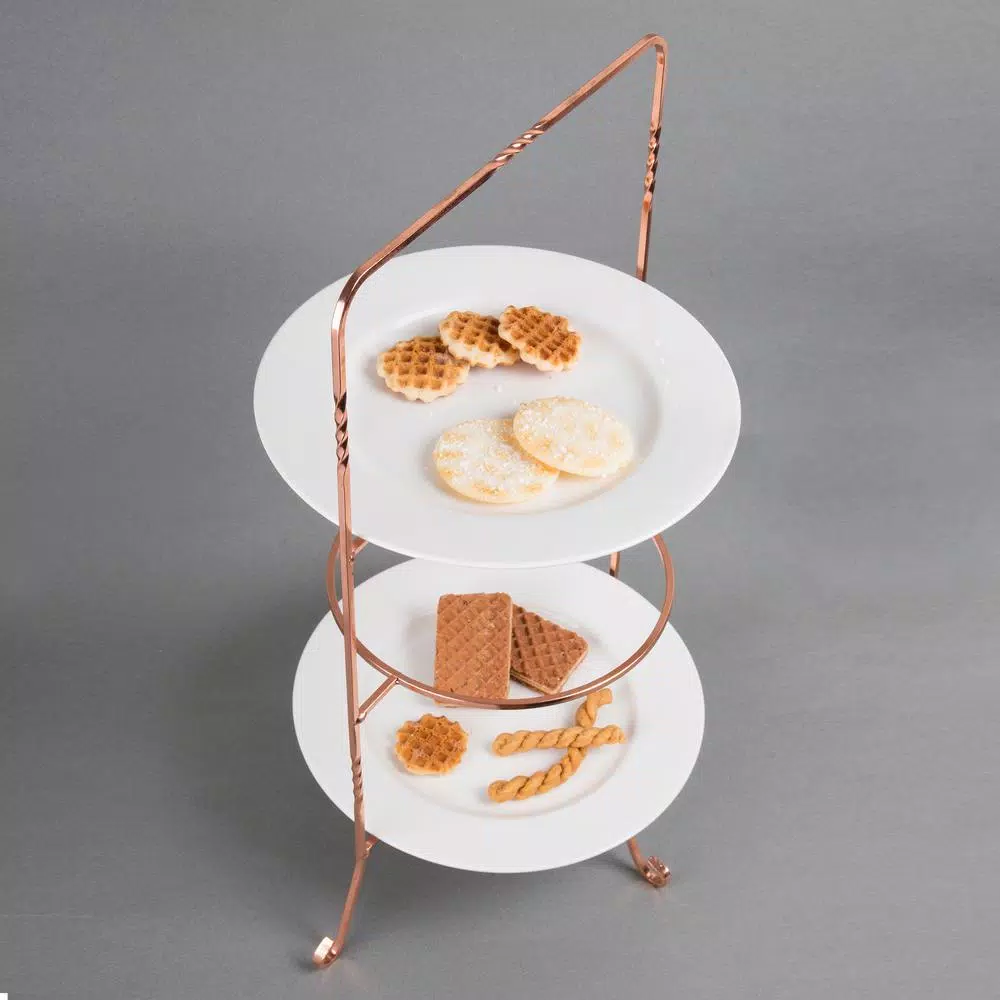 Handcrafted by skilled artisans. Dimensions: 13 in. x 10 in. x 20 in. H . Plate can fit: less than 10-3/4 in. Dia.; 8 in. W each tier (ring/circle width). Copper plated with an updated design featuring wide based legs for sturdy construction and stylish design. Perfect for display and serve your tasty dishes either of our attractive dessert or dinner plate racks.