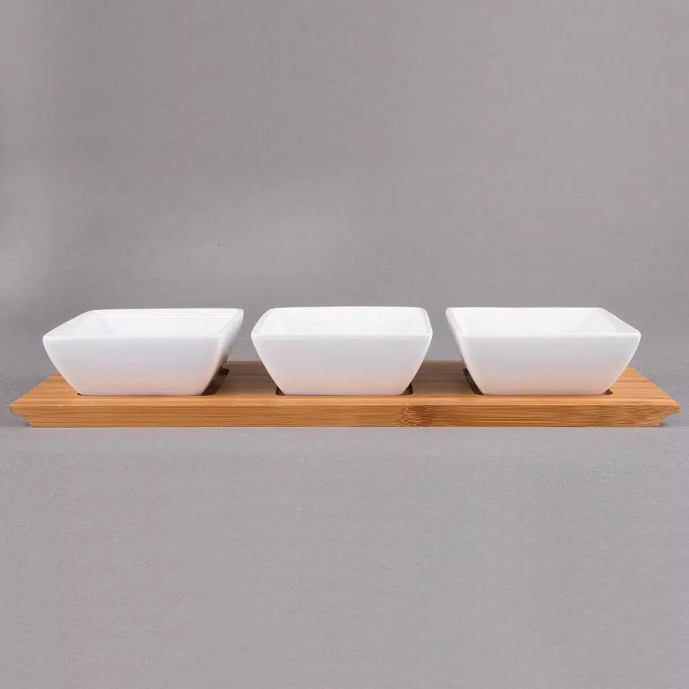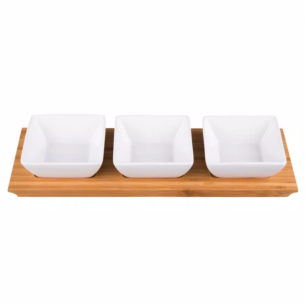 Set includes 3-stoneware square bowls and 1-natural bamboo serving tray. Overall size: 13-3/8 in. x 4-3/4 in. x 2 in. H; bowl size: 3-3/4 in. x 3-3/4 in. x 1-5/8 in. H; board size: 13-3/8 in. x 4-3/4 in. x 1/2 in. H. Fabulous design, perfect for serving snacks, appetizers or use for dips, sauces, condiments and toppings. Perfect for any occasion. Also makes a thoughtful housewarming, bridal shower or birthday gift. Fresh and natural appearance. Stoneware bowls are dishwasher safe. Bamboo serving tray is hand wash only, wipe clean.