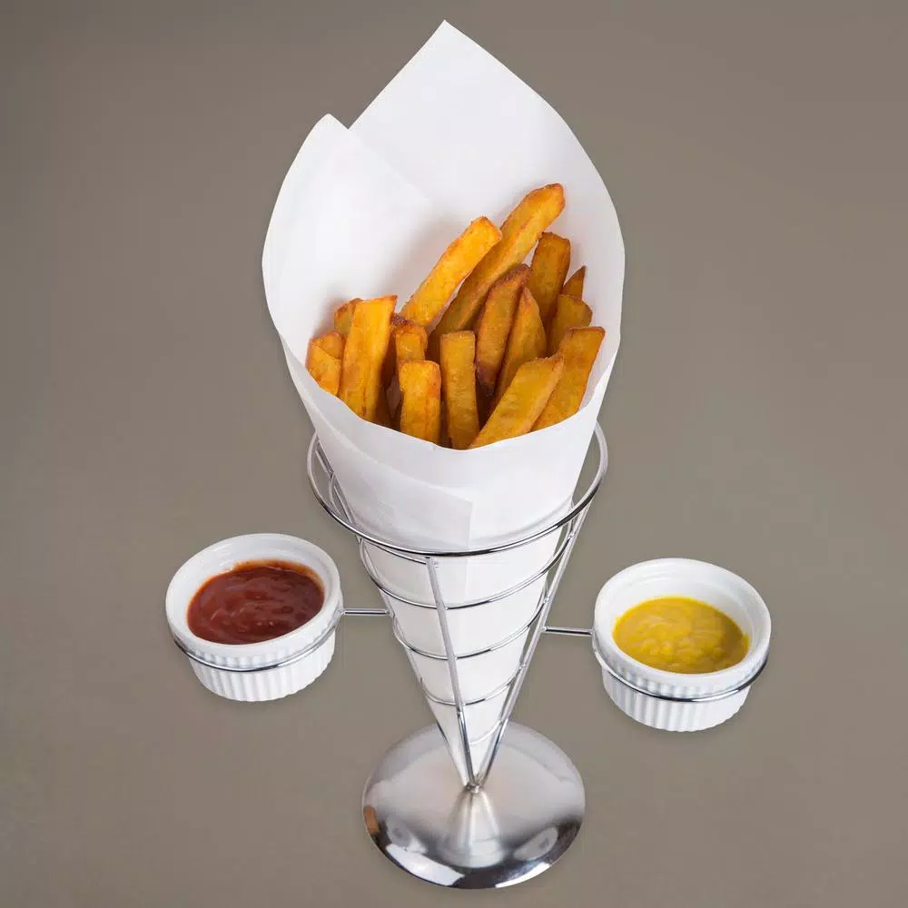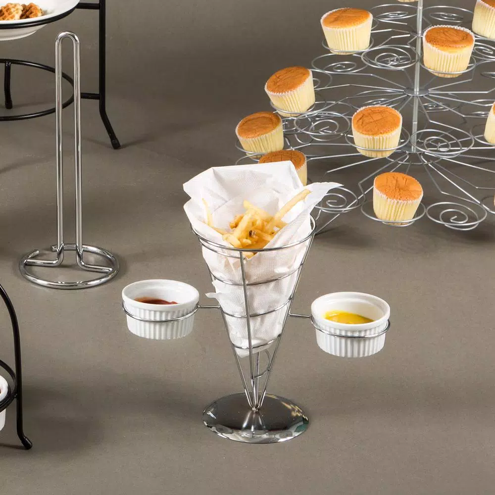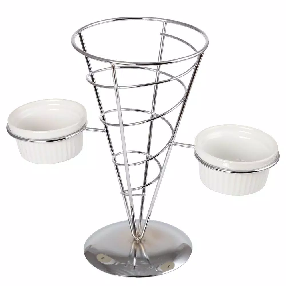 Metal wire holder is in chrome finish. 2-round wire condiment cup holders attached. Holds French fries and your favorite dipping sauce in one stylish holder. Perfect for French fries, mozzarella sticks, chicken fingers, onion rings or other appetizers. Great for serving appetizers at home, cafe, lounge or in restaurant.