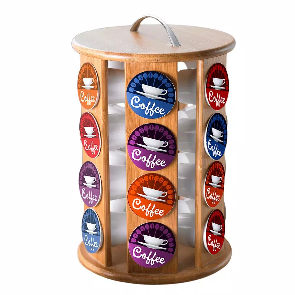 Creative Home revolving single server coffee pod carousel holds up to 24-flavored coffee pods. Have your favorite flavor at your fingertips right next to your coffee maker. Sleek top handle for easy rotation. Made of renewable bamboo.