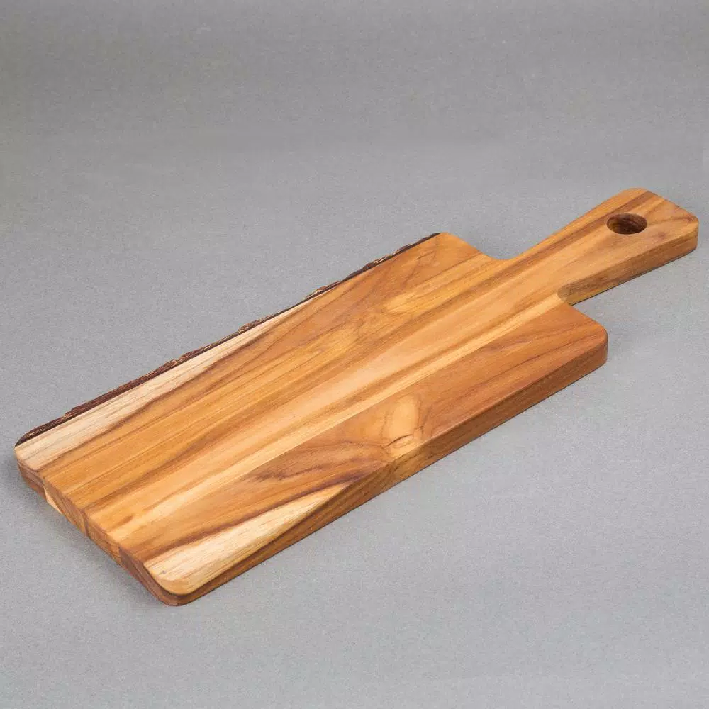 This rustic-styled wood paddle board is crafted from sustainable Teak wood and boasts stunning exposed wood grain. Dimensions: 14″ x 5″ x 5/8″ H. This 14″ x 5″ paddle board is ideal for mincing, cutting and slicing. Perfect for preparing and serving foods such as bread and cheese. Easy to clean, hand washing recommended.