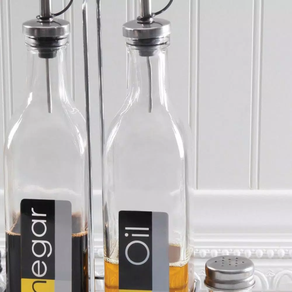 The stainless-steel rack holds oil and vinegar bottles and salt and pepper shakers. The clear glass design compliments every tabletop display. Perfect for everyday use, festive occasions or to tote to patio or poolside for outdoor dining. Oil and vinegar bottles feature stoppers for easy pouring and less mess.