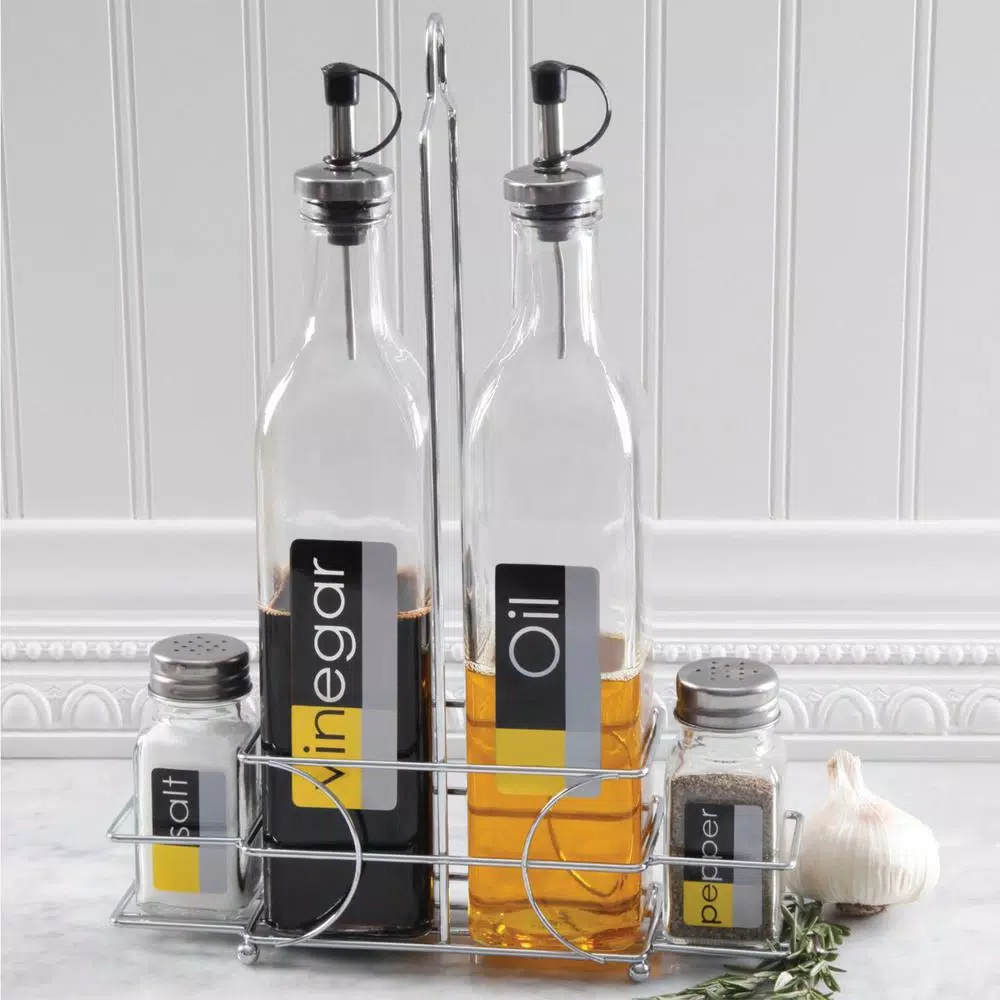 - Set includes: 8.5 oz. oil bottle, 8.5 oz. vinegar bottle, 3.5 oz. salt shaker, 3.5 oz. pepper shaker, 1-stainless steel stand