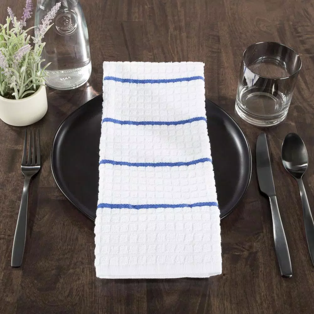 Keep your kitchen and dining area clean and spotless with the Multi-Color Waffle Weave Striped and Solid Color 8-Piece Kitchen Towel Set by Lavish Home. The kitchen towels feature a chic waffle pattern on bright backdrops that give them a simple yet attractive look. Made of 100% cotton, these towels are highly absorbent and help dry dishes and surfaces quickly.