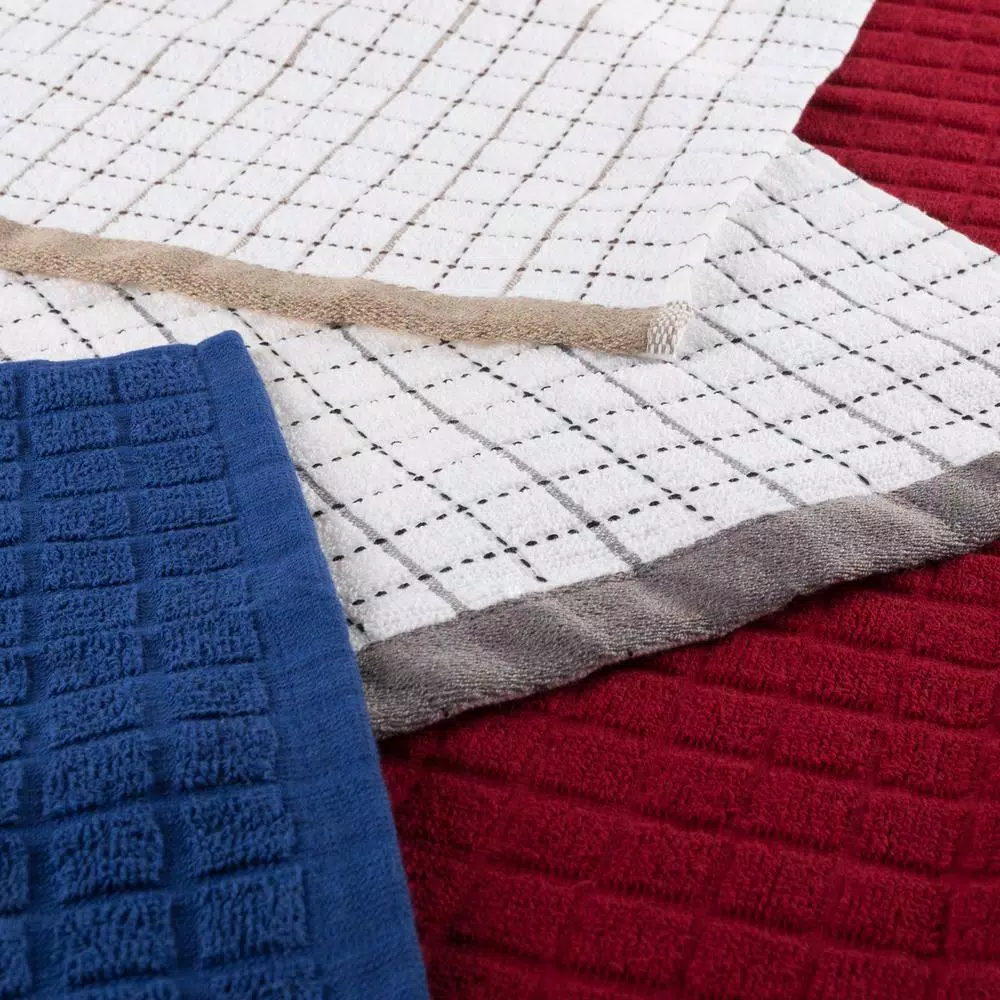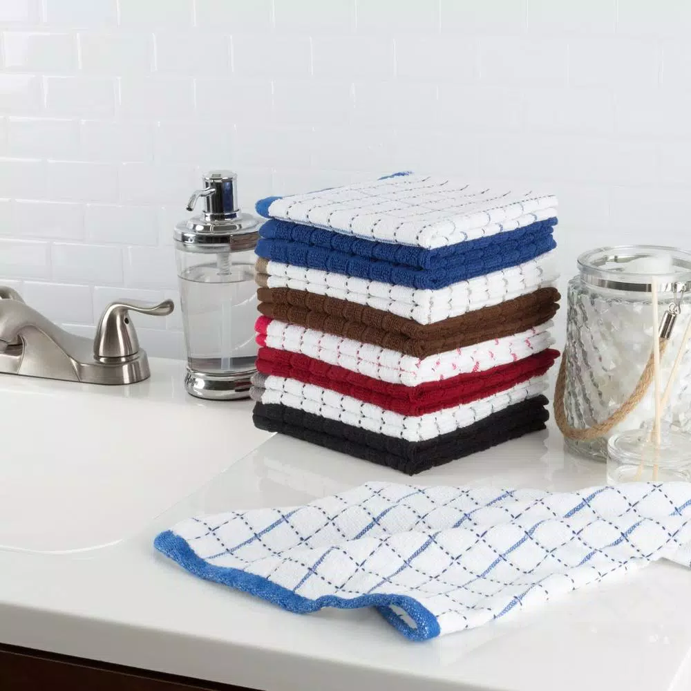 Stylishly stock your kitchen and home with this Windowpane Pattern Cotton Kitchen Was Towels Set of 16. These dish washclothsfeature a windowpane style built into the fabric, providing a modern pattern as well as an enhanced texture for washing or cleaning. This pack also features both a checkered pattern and typical solid colors that are able to coordinate with any decor or make the perfect housewarming gift.