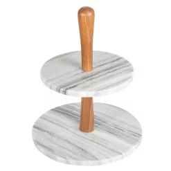 Serveware Creative Home 2-Tier Natural Marble And Acacia Wood Cake Dessert Stand, Fruit Plate, Pastry Server, Off-White