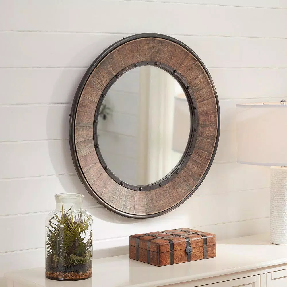 Add a touch of rustic charm to any wall in your home with the 31 in. Diameter Medium Round Farmhouse Accent Mirror with Wood Finish from Home Decorators Collection. It features a sturdy metal frame with a distressed wood finish that complements a farmhouse-style decor. With two D-rings on the back, this accent mirror is ready to display in your living room, entryway or bedroom. Use a soft cloth with standard glass cleaner to keep this decorative mirror clean and shiny.
