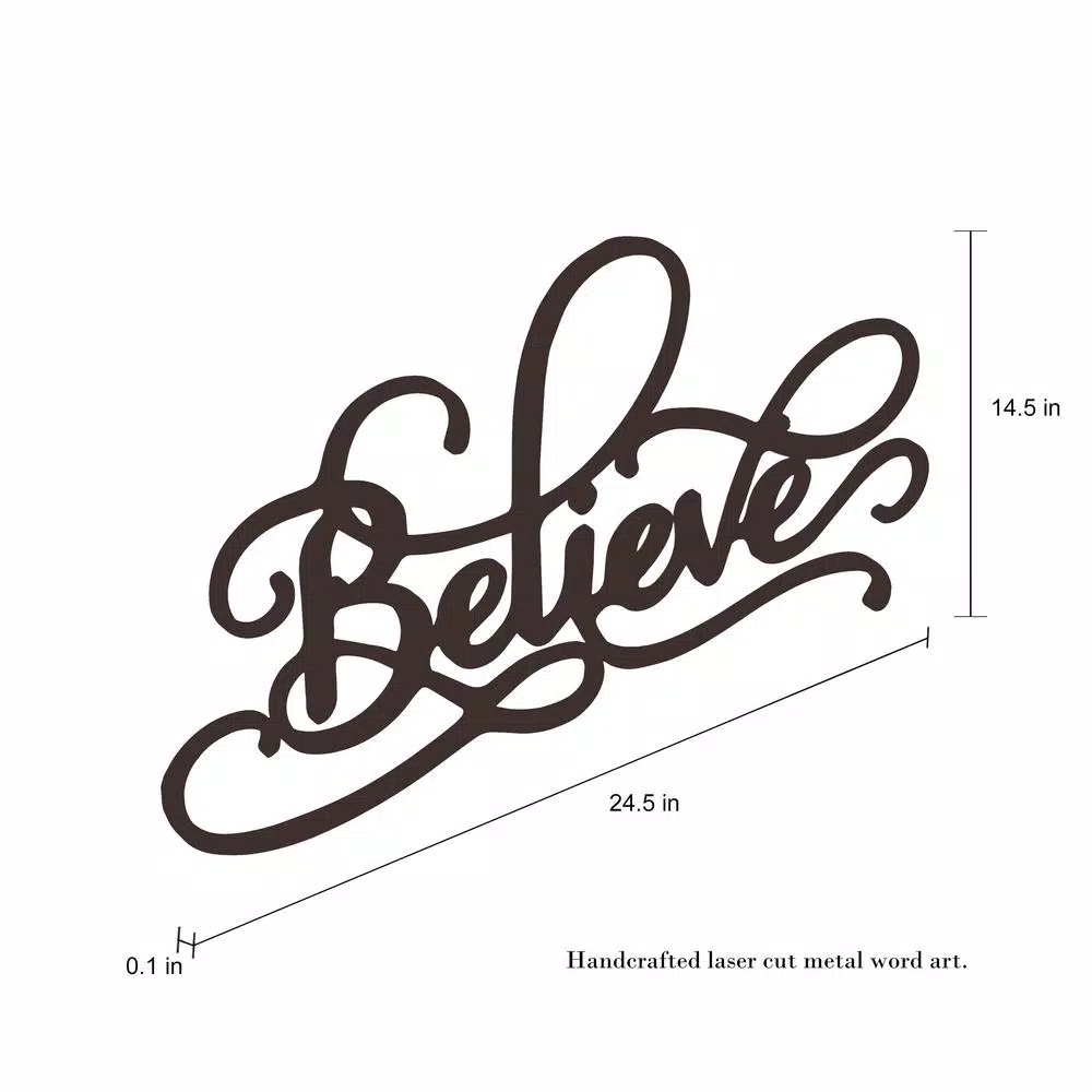 The Metal Cutout Believe Sign by Lavish Home is a beautiful addition to any home decor. With an attractive distressed dark brown finish, this inspiring word art will complement any style of interior design, from modern rustic to vintage farmhouse chic. Perfect for home or office, this versatile and uplifting piece is a great touch for your living room, kitchen, bedroom, bath, or front entryway. With a soft looping cursive silhouette, this sign shares a warm sentiment to welcome guests, friends and family.